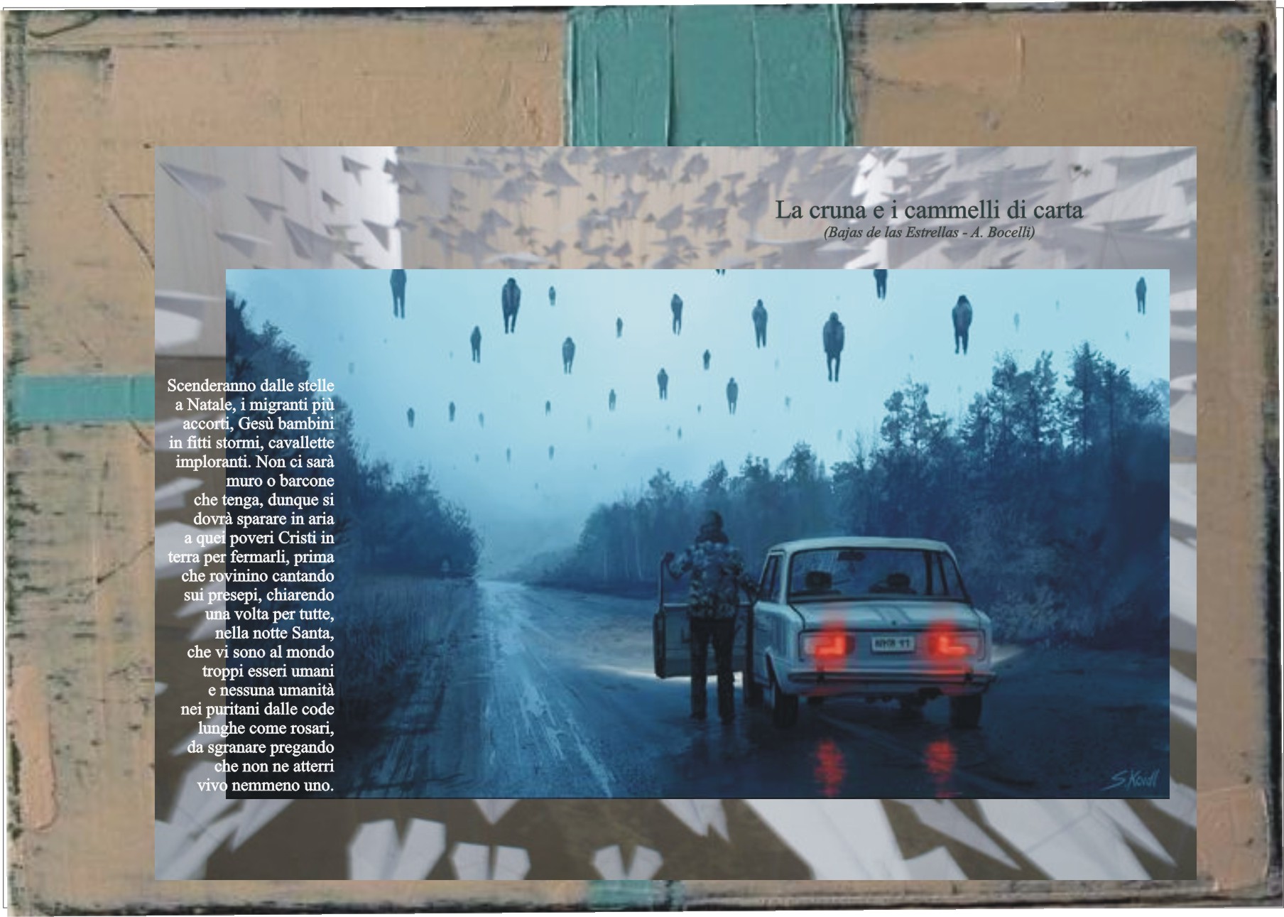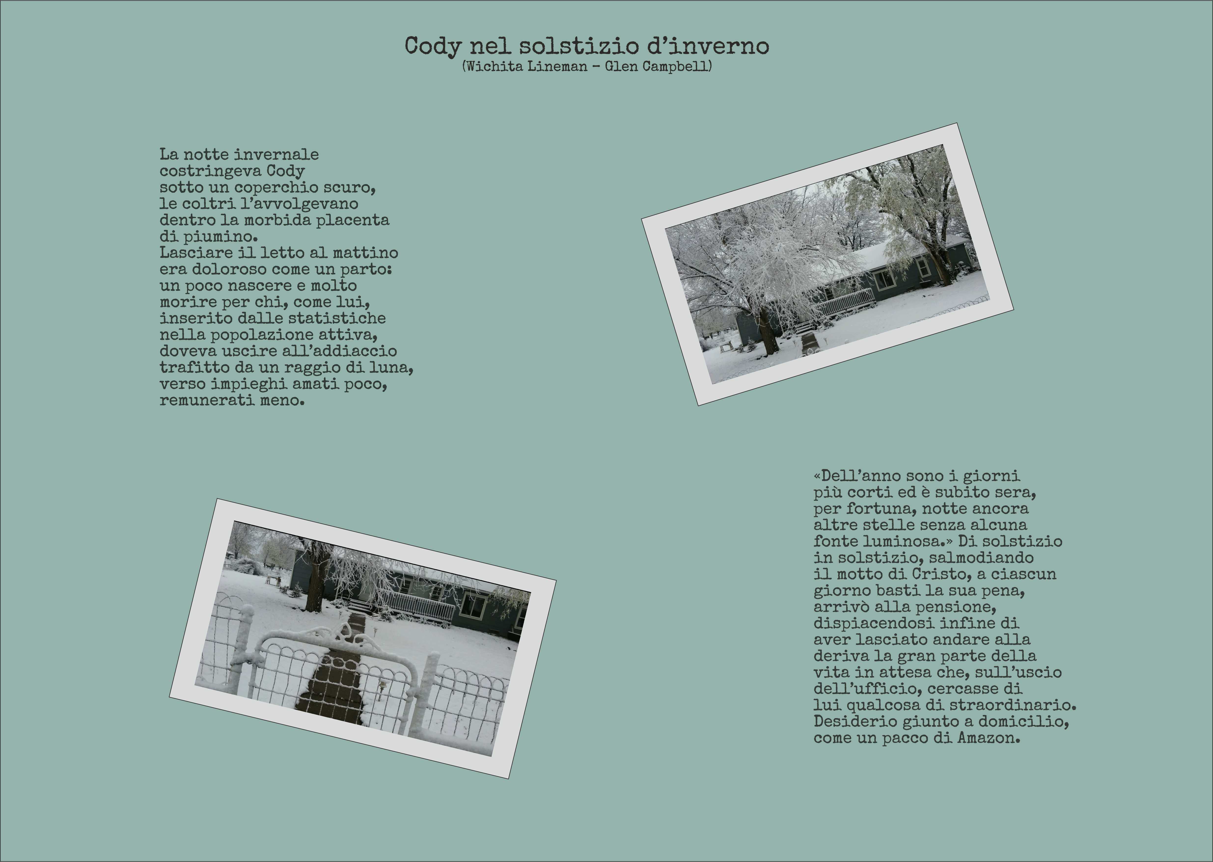 Quindi abbiate fede (Emilio?) che non lasciamo il campo, ed appena risolta la questione vi sotterreremo di demenzialità varie, in gamma ampia. Per ora, contentatevi di auguri natalizi tardivi, di felice anno anticipati, e, centellinando, di qualche poesia in soli versi sciolti da colori e sfondi.