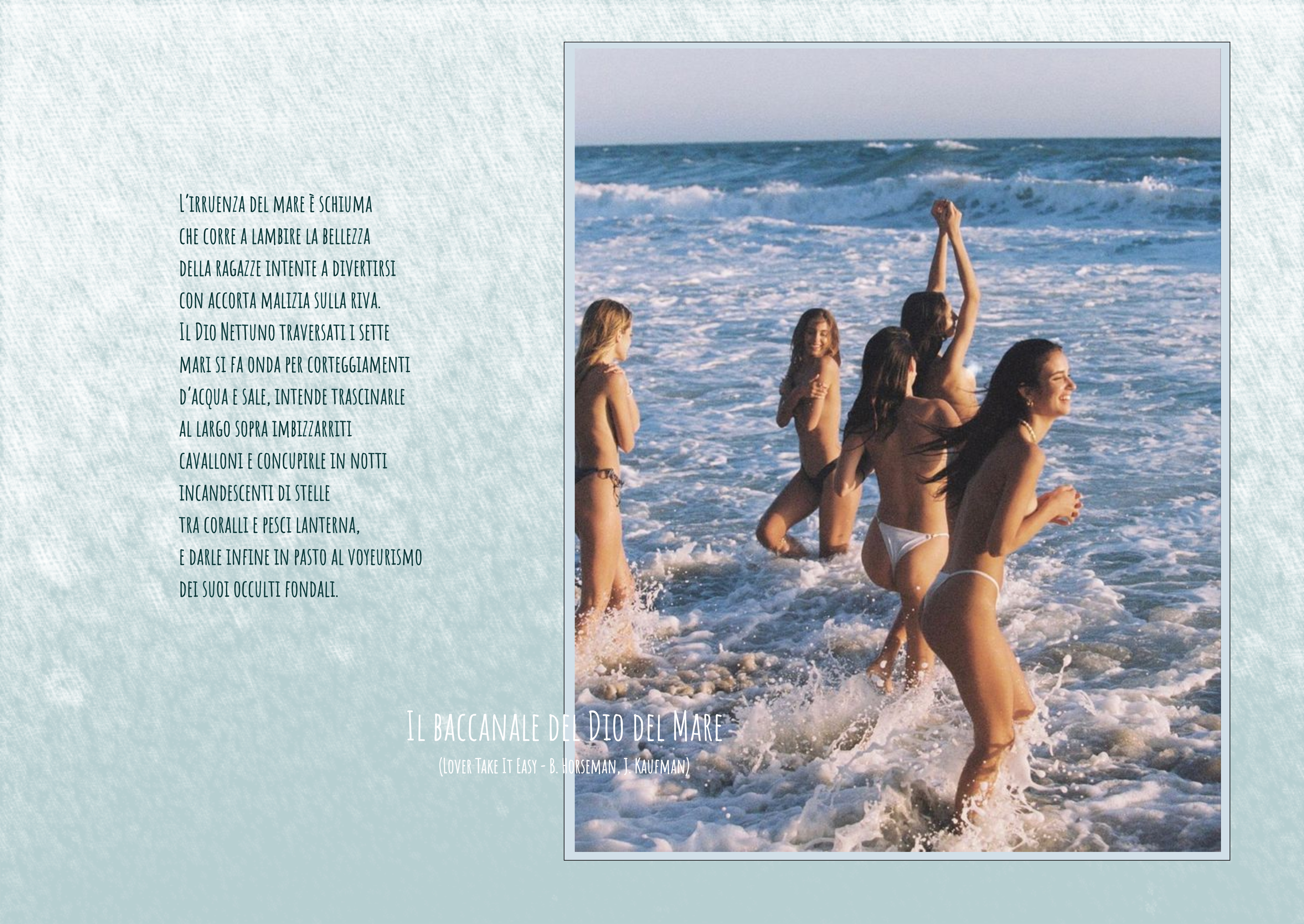Sarà pure banale, ma una pura home page stagionale concedetecela. Che, tanto, se le immagini sono da cartolina o da vecchi guardoni (uno dei due come sempre è gran fotografo), le parole ed i tempi ondeggiano sotto il, sole, e dal lieve svagato si accostano spesso e volentieri al meditoso e riflessoso. Buona estate, affezionati.