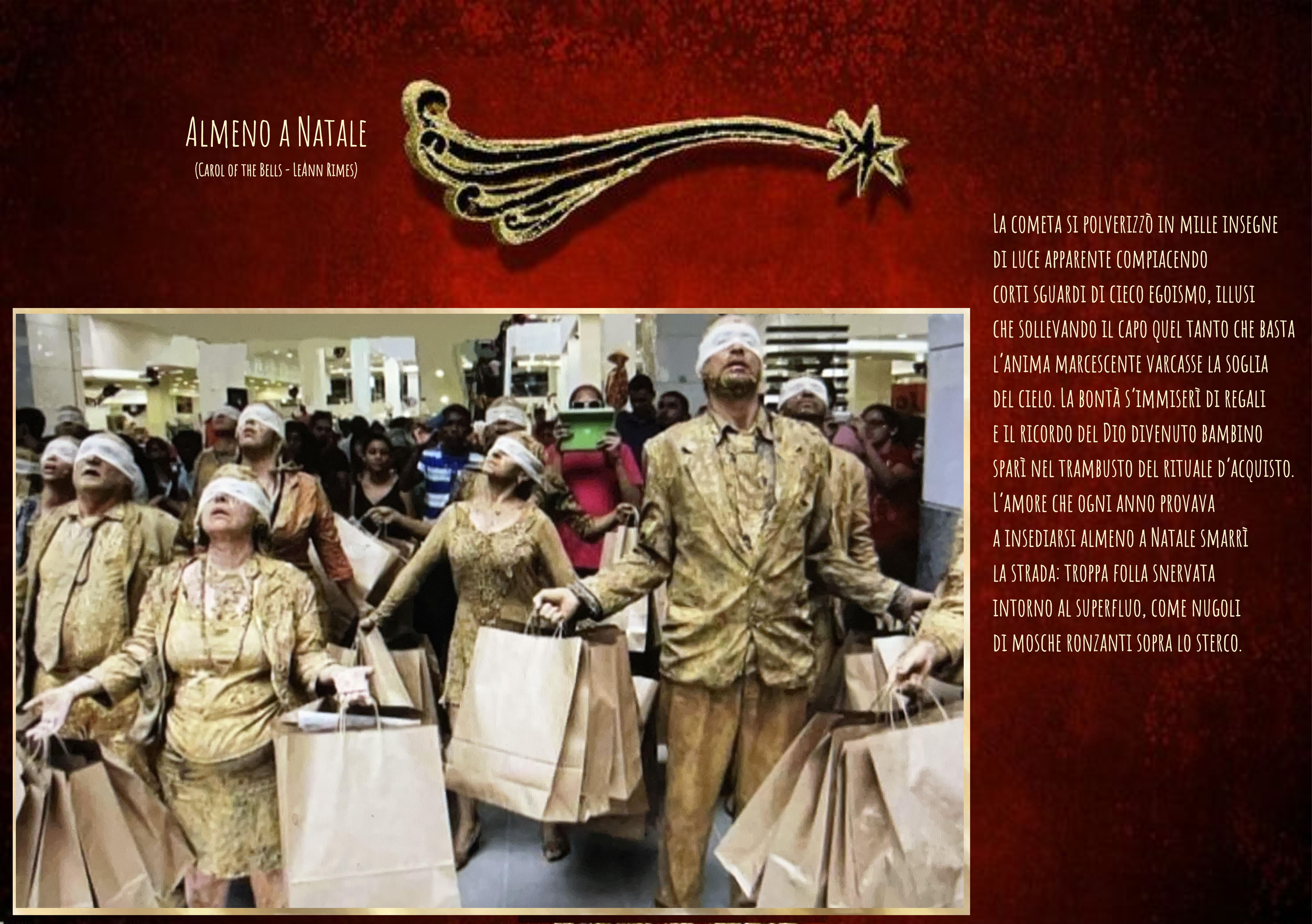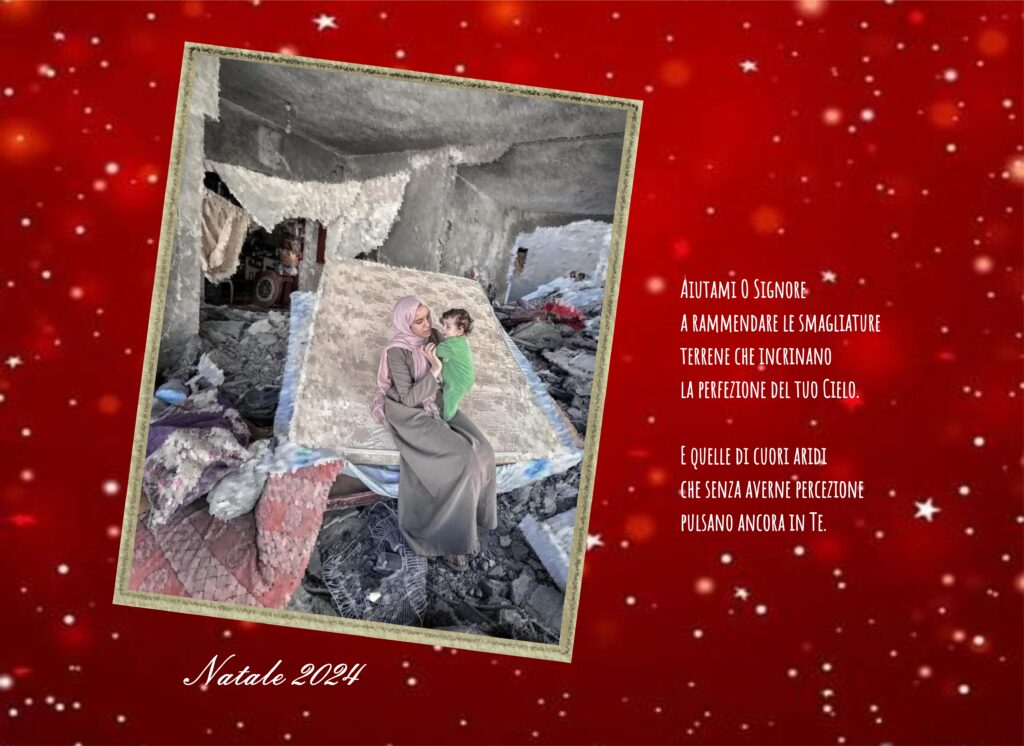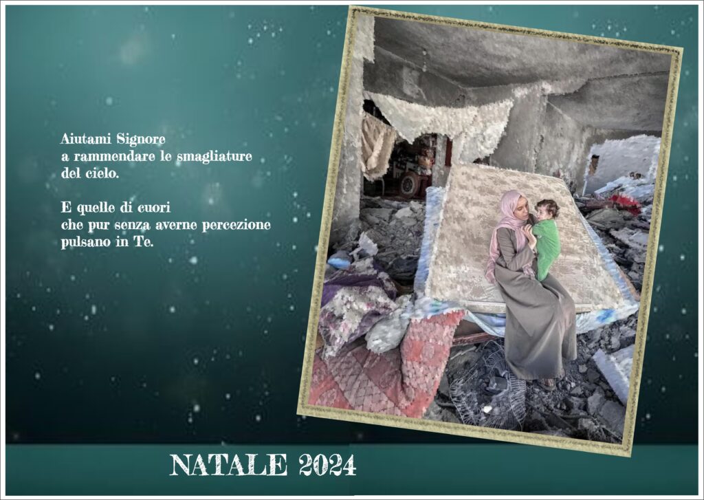Almeno a Natale cosa? Il delirio consumistico? L’alienazione varia? la memoria nebulosa e nostalgica di altri tempi forse distorti nella memoria? O magari, chissà, una piccola preghiera a Chi si fa presente e chiede d’essere accolto col cuore e non con la carta di credito? Forse un reincontro tra di noi? Forse?… Buon natale a tutti